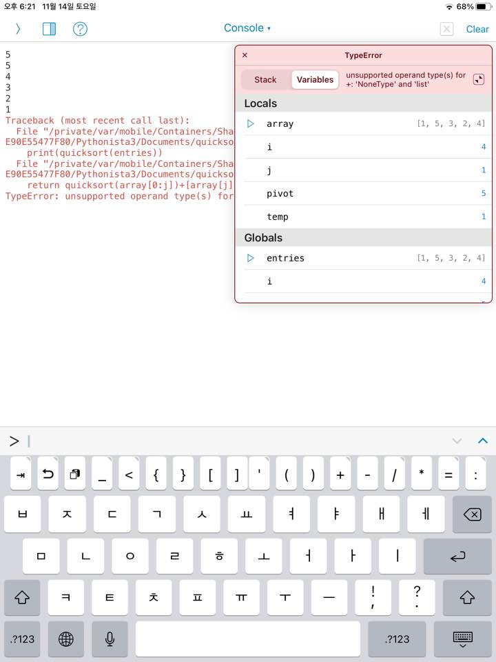 실행 화면. 오류 메시지를 출력해주고, 변수 목록과 오류를 표시해준다.
