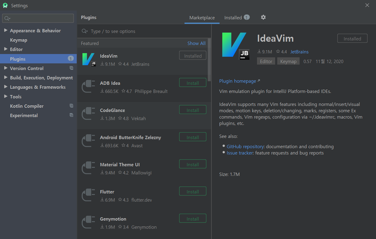 안드로이드 스튜디오에는 Vim을 그대로 이용할 수 있는 ideaVim이라는 플러그인이 존재한다.