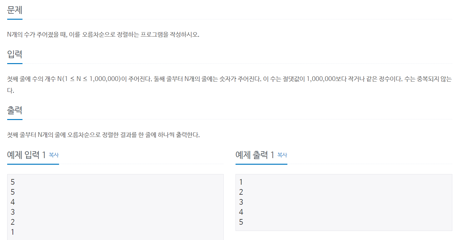 입력된 갯수만큼 수를 입력하고,해당 수열을 오름차순으로 정렬해야하는 문제이다.
