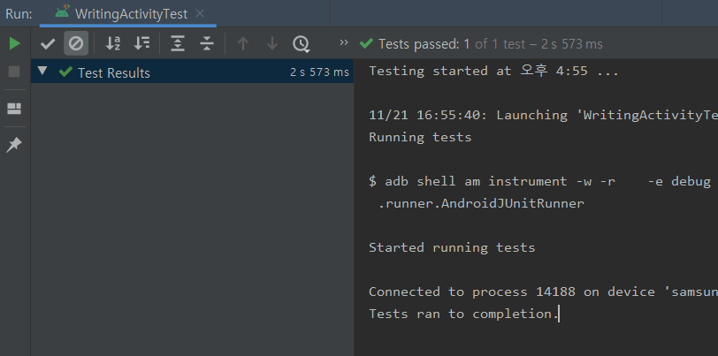 package com.lilac.lilacstory.Writing; import androidx.test.espresso.Espresso; import androidx.test.espresso.action.ViewActions; import androidx.test.espresso.assertion.ViewAssertions; import androidx.test.espresso.matcher.ViewMatchers; import androidx.test.ext.junit.runners.AndroidJUnit4; import androidx.test.rule.ActivityTestRule; import com.lilac.lilacstory.R; import org.junit.Before; import org.junit.Rule; import org.junit.Test; import org.junit.runner.RunWith; @RunWith(AndroidJUnit4.class) public class WritingActivityTest { private String stringTobeTyped=""; @Rule public ActivityTestRule<WritingActivity> activityTestRule = new ActivityTestRule<>(WritingActivity.class); @Before public void initValidString() { stringTobeTyped="Hello"; } @Test public void changeText() { Espresso.onView(ViewMatchers.withId(R.id.edt_writing)) .perform(ViewActions.typeText(stringTobeTyped),ViewActions.closeSoftKeyboard()); Espresso.onView(ViewMatchers.withId(R.id.edt_writing)) .check(ViewAssertions.matches(ViewMatchers.withText(stringTobeTyped))); } }내가 연습용으로 작성한 테스트 코드이다.