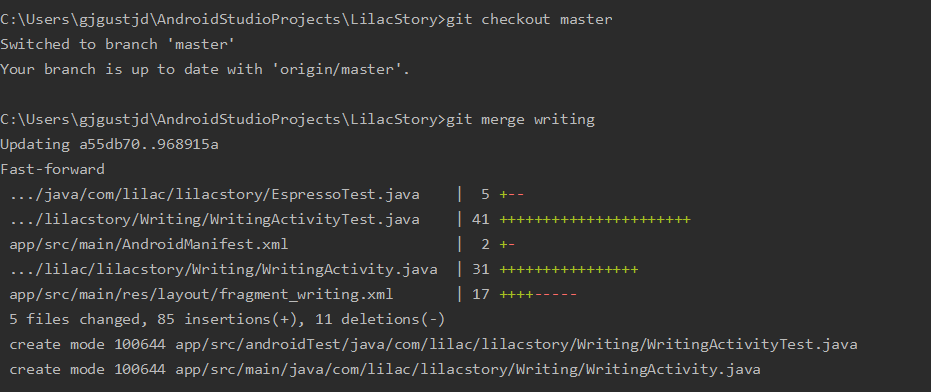 이후로 변경된 것은 브랜치 뿐이고, 마스터의 경우 변경된 사항이 없는 경우에는 병합이 매우 쉽게 진행되는데,