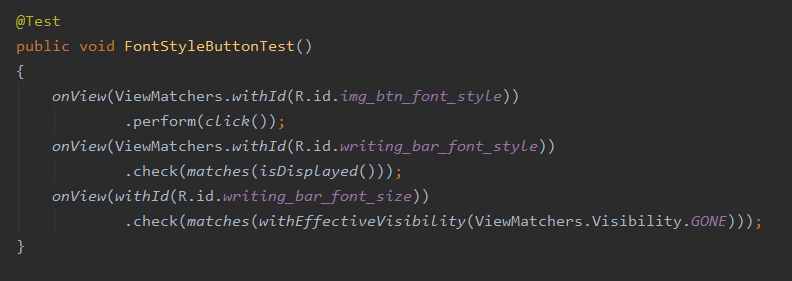 우선은 텍스트 뷰와 에딧텍스트 이미지 버튼등의 갖가지 뷰들을 배치하였고,이들이 뷰 상에서 동작해야할 테스트를 작성하려고 했는데