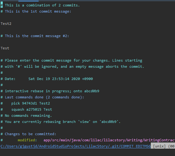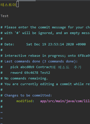 위와 같이 커밋 메시지를 수정하라는 화면이 나오고, 거기서 메시지를 수정하면 된다.
