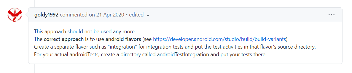 android { ... sourceSets { main { manifest.srcFile 'src/main/AndroidManifest.xml' java.srcDirs = ['src/main/java'] res.srcDirs = ['src/main/res'] } integrationTest { manifest.srcFile 'src/test/AndroidManifest.xml' java.srcDirs = ['src/main/java'] res.srcDirs = ['src/main/res'] } } ... }위 코드 또한 앱 수준의 build.gradle 파일에 추가해준다.